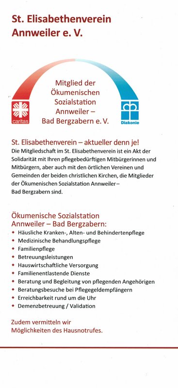 Wie inzwischen bekannt wurde, wird die Ökumenische Sozialstation Annweiler–Bad Bergzabern ab Oktober wieder aktiv in der Region Albersweiler, Dernbach, Ramberg, und Eußerthal tätig sein. Nach einer vorübergehenden Pause wird die pflegerische und medizinische Versorgung in diesem Gebiet wieder aufgenommen, unterstützt durch ihr erfahrenes Team.