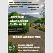 ANSPRECHBAR - Seelsorge auf dem Friedhof vor Ort mit Gemeindereferentin Marina Mathias Termine: Friedhof Silz am 12.01.2026 - ab 15.30 Uhr Kommen Sie einfach vorbei! weiterlesen
