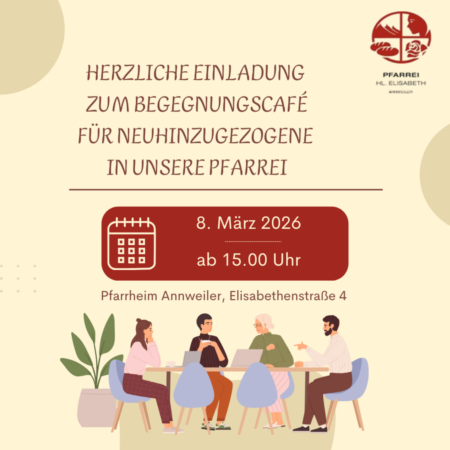 Wir möchten alle, die neu in unsere Pfarrei hinzugezogen sind, zu einem Begegnungscafé mit Kaffee und Kuchen, am 8. März 2026, um 15.00 Uhr ins Pfarrheim Annweiler (Elisabethenstraße 4) einladen.