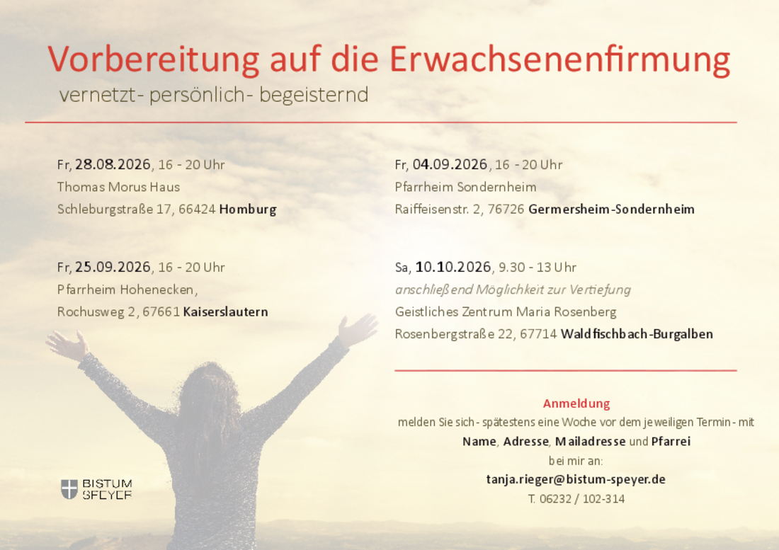 Ebenfalls bietet das Bistum eine Vorbereitung auf die Erwachsenenfirmung an. Die Termine finden Sie auf dem Flyer.