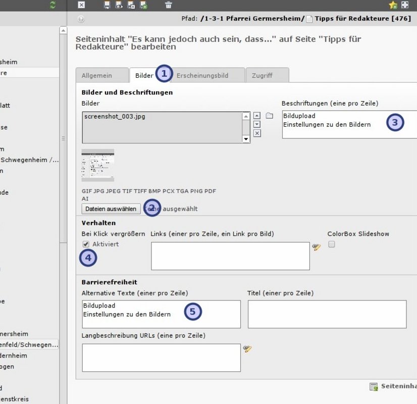 Soll ein Beschreibungstext zum Bild angezeigt werden, können Sie pro Bild jeweils eine Zeile bei [Bildupload - 3] eingeben. Der Alternativtext bei [Bildupload - 5] hilft den Suchmaschinen beim Erfassen der Bildinhalte.